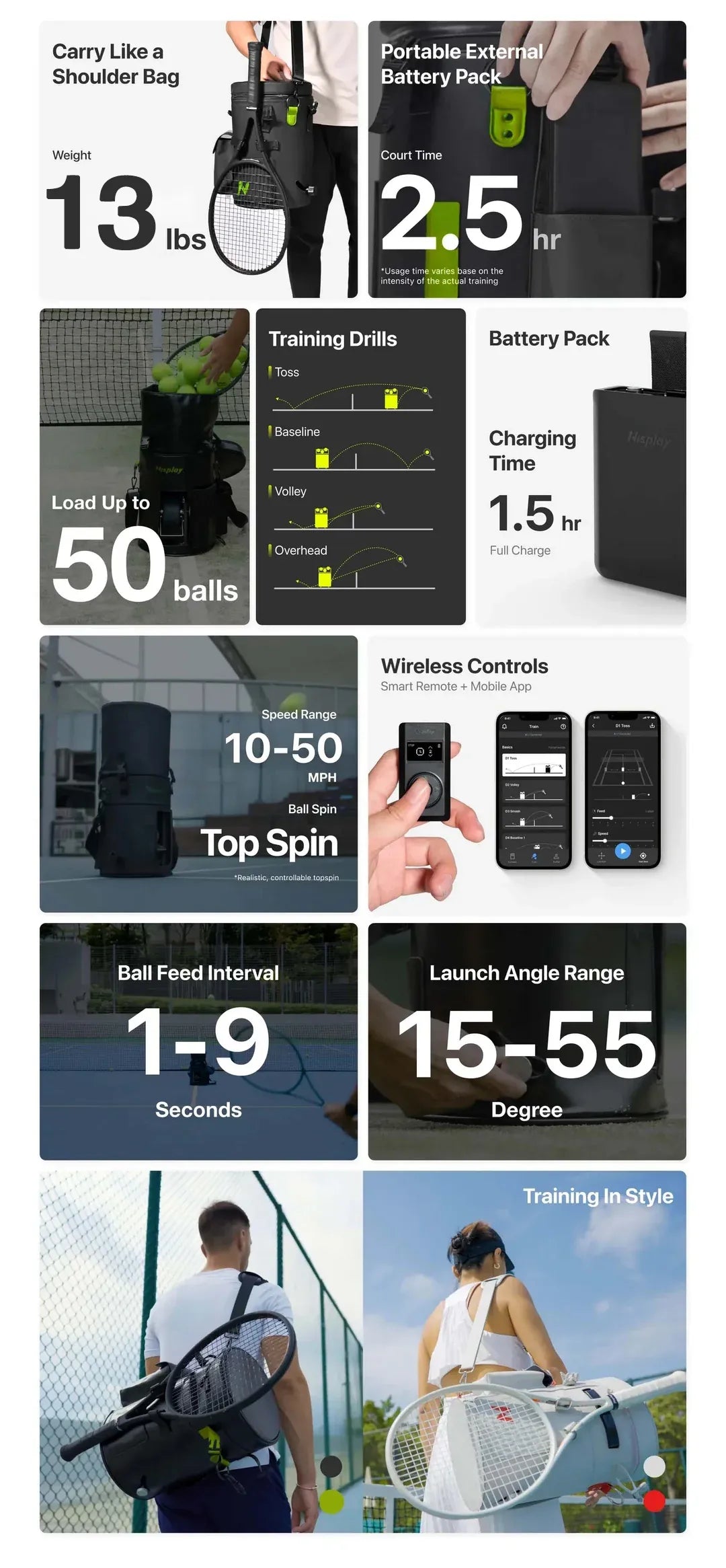 Nisplay L1's adjustable settings allow for precise speed, ball feed interval, launch angle controls. Players can target different techniques in their trainings.